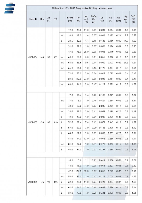 Table 1. Recent Drill Results from the Millennium Cobalt Project, Mt Isa, Queensland, Australia.