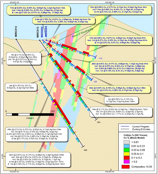 - within a thick low-grade envelop of 80 metres at 0.07% CoEq consisting of 0.058% Co and 0.072% Cu.