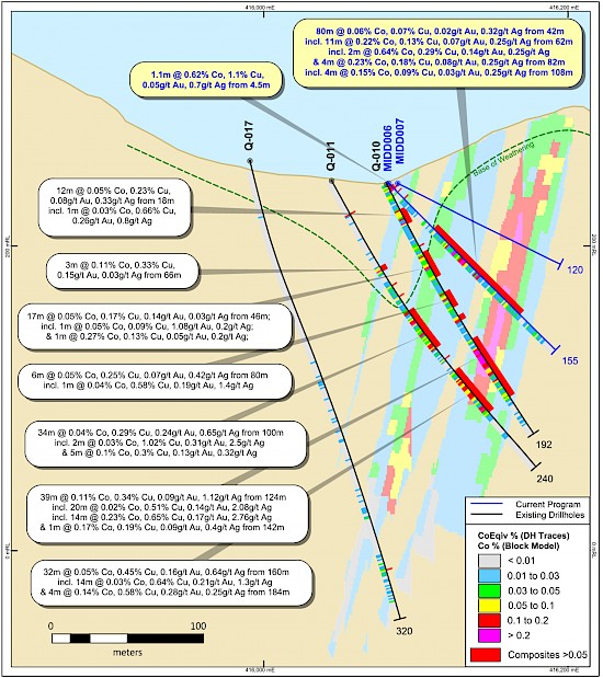 Results in diamond drill hole MIDD006 on section 7723590mN again show good correlation to the overall mineralised zones in historic drill hole Q-10 and Q-11. In this case grades in the new drill holes indicate higher cobalt grades, potentially supporting the concept of higher grades zones of both cobalt and copper mineralisation within wide zones of mineralisation (Figure 2). The Company eagerly awaits the results from drill hole MIDD007, and overcut of MIDD006.