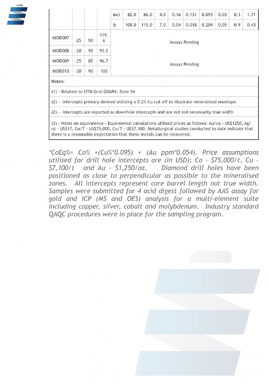 *CoEq%= Co% +(Cu%*0.095) + (Au ppm*0.054). Price assumptions utilised for drill hole intercepts are (in USD); Co - $75,000/t, Cu - $7,100/t and Au - $1,250/oz. Diamond drill holes have been positioned as close to perpendicular as possible to the mineralised zones. All intercepts represent core barrel length not true width. Samples were submitted for 4 acid digest followed by AAS assay for gold and ICP (MS and OES) analysis for a multi-element suite including copper, silver, cobalt and molybdenum. Industry standard QAQC procedures were in place for the sampling program.