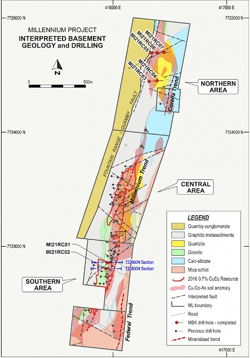 Figure 2: Millennium Project plan view showing interpreted basement geology, existing Millennium resource zones, previous and MBK drilling plus exploration targets, including the Northern Area extension target zone.