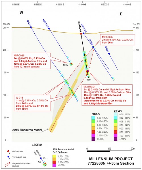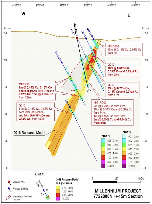 MI21RC01 was undertaken to infill a gap in the 2016 resource model in an area of low confidence drilling (Figures 2 and 3). Two main, broad zones of Cu-Co mineralisation and associated alteration were noted including semi-massive sulphides of bornite, chalcopyrite and pyrite. These two zones returned assay results of 17m @ 0.33% Cu, 0.08% Co and 0.12g/t Au from 56m (with peak 1m assay values of 0.91% Cu), and 16m @ 1.07% Cu, 0.26% Co and 0.40g/t Au from 80m, including a high grade zone of 5m @ 2.92% Cu, 0.50% Co and 1.19g/t Au from 82m. In addition, several other intervals of notable elevated Cu and Co were returned.