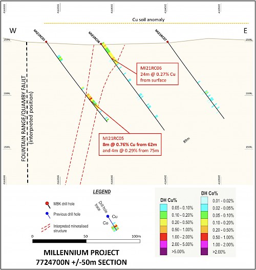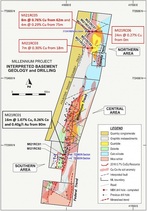 First-pass drilling in the Northern Area for (MI21RC03-07) has been completed, testing anomalous surface Co-Cu geochemistry, previously mapped geological units and structures similar to mineralisation features in the Southern and Central Areas. This area is approximately 800-1000m north along strike, has had no previous drilling and does not form part of the existing Millennium resource. Drilling was conducted in two fences on two lines 250m apart.