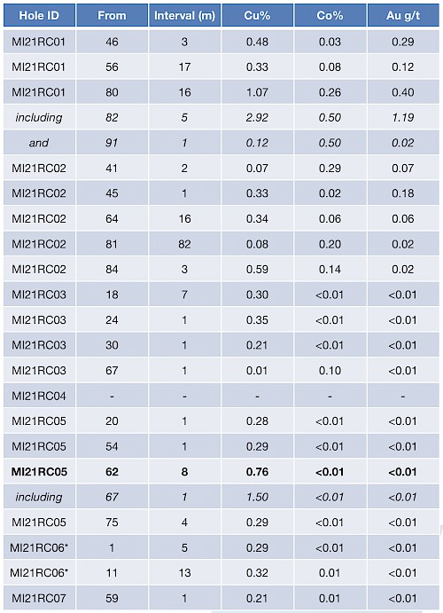 • 16m @ 1.07% Cu, 0.26% Co and 0.40g/t Au from 80m including a high-grade zone of 5m @ 2.92% Cu, 0.50% Co and 1.19g/t Au from 82m (MI21RC01)
