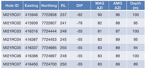 A further 5 RC holes for 478m (MI21RC03-07) were completed in the Northern Area (also shown in Figure 1) testing potential for mineralisation extensions in the northern part of the Project area as indicated by previous mapping, geochemistry and structural interpretation. Refer to Table 1 and Table 2 for full drilling details.