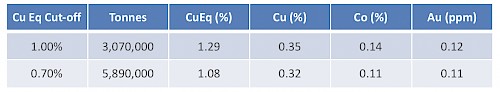 Copper equivalent (CuEq) calculation was based solely on commodity prices using prices as follows: Cu: US$4,600/t; Co: US$27,000/t; Au: US$1,330/oz; and Ag: US$20/oz