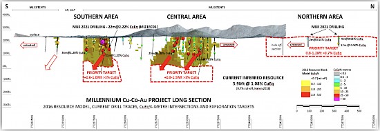 Figure 3: Millennium Cu-Co-Au Project long section showing existing drilling, current resource blocks and priority targets. NB: Intervals are CuEq%-metre as previously reported.4