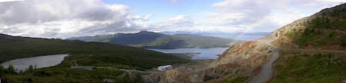 Figure 1. View over the open pit part of the Bruvann Nickel mine, looking north-east, with the shipping quay in the background.