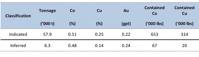 - Indicated Resource of 0.51% Co (57,900 tonnes) and Inferred Resource of 0.48% Co (6,300 tonnes) at a 0.25% cut-off (see Table 1).
