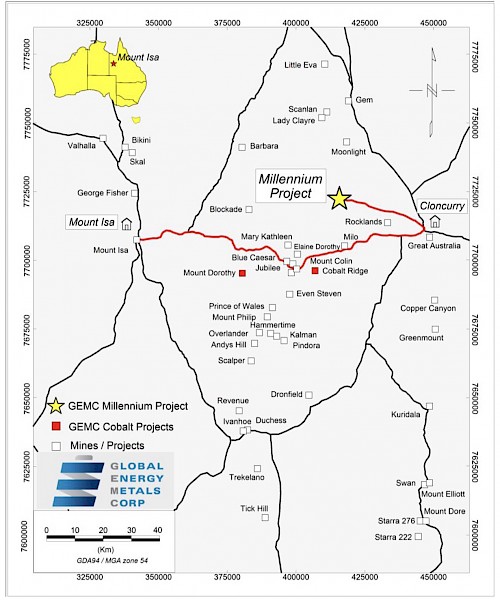 Through its wholly-owned subsidiary, Element Minerals Australia PTY, Global Energy Metals has established extensive tenement holdings totaling 2,560 hectares (6,326 acres) across the Mount Isa and Cloncurry mining districts in northwest Queensland, Australia. This commanding land package contains a number of properties with significant cobalt, copper, gold and base metal exploration potential. These range from undeveloped exploration prospects to JORC-compliant resources. The properties include the Millennium Cobalt Copper Gold deposit, and the Mount Dorothy and Cobalt Ridge exploration prospects.