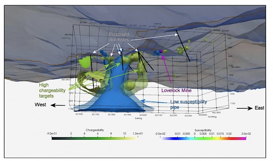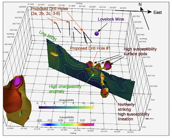 Figure 2 – Lovelock Mine Project Phase 1 Drill Program map outlining the proposed 8 drill holes with corresponding high susceptibility surface pods and chargeability targets.