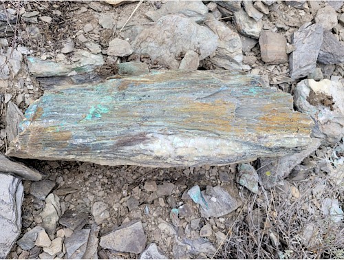 Figure 2. Copper oxide staining on rocks located in a newly discovered historical pit in the south of the property.