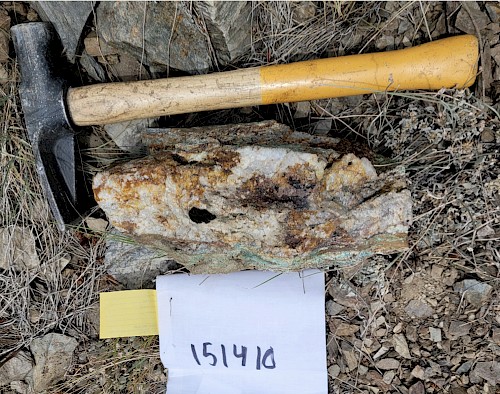 Figure 3. Rock sample from outcrop within historical mineralized trench located along strike between the central and southern showings.