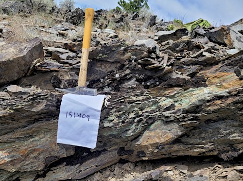 Field crews visited four known mineral occurrences (Jackson/Baker, Hungry Hill Mine, Anderson and North Showing) and confirmed the high-grade Cu-Ag (+/- Au) mineralization at all locations. Outcrop is sparse throughout the property and commonly only exposed by historical workings. Observed mineralization style and grade is similar across all showings, with notably higher copper grades (up to 20.9% Cu) at Hungry Hill, while the North Showing had the highest gold values (up to 11.4 g/t Au). High grades of silver (greater than 80 g/t Ag) were associated with all mineral occurrences.