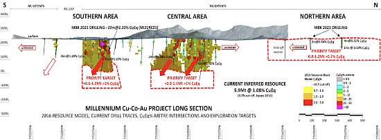Figure 1: Millennium copper-cobalt long section showing current (2016) Inferred Resource model, resource drilling traces and CuEq%-metre intersections, interpreted mineralisation shoots, and priority targets for Phase 1 work program to define and confirm the Exploration Target and project scale prior to resource and peripheral exploration drilling. Refer to Appendix 1 and 2 drill hole CuEq% and location details.